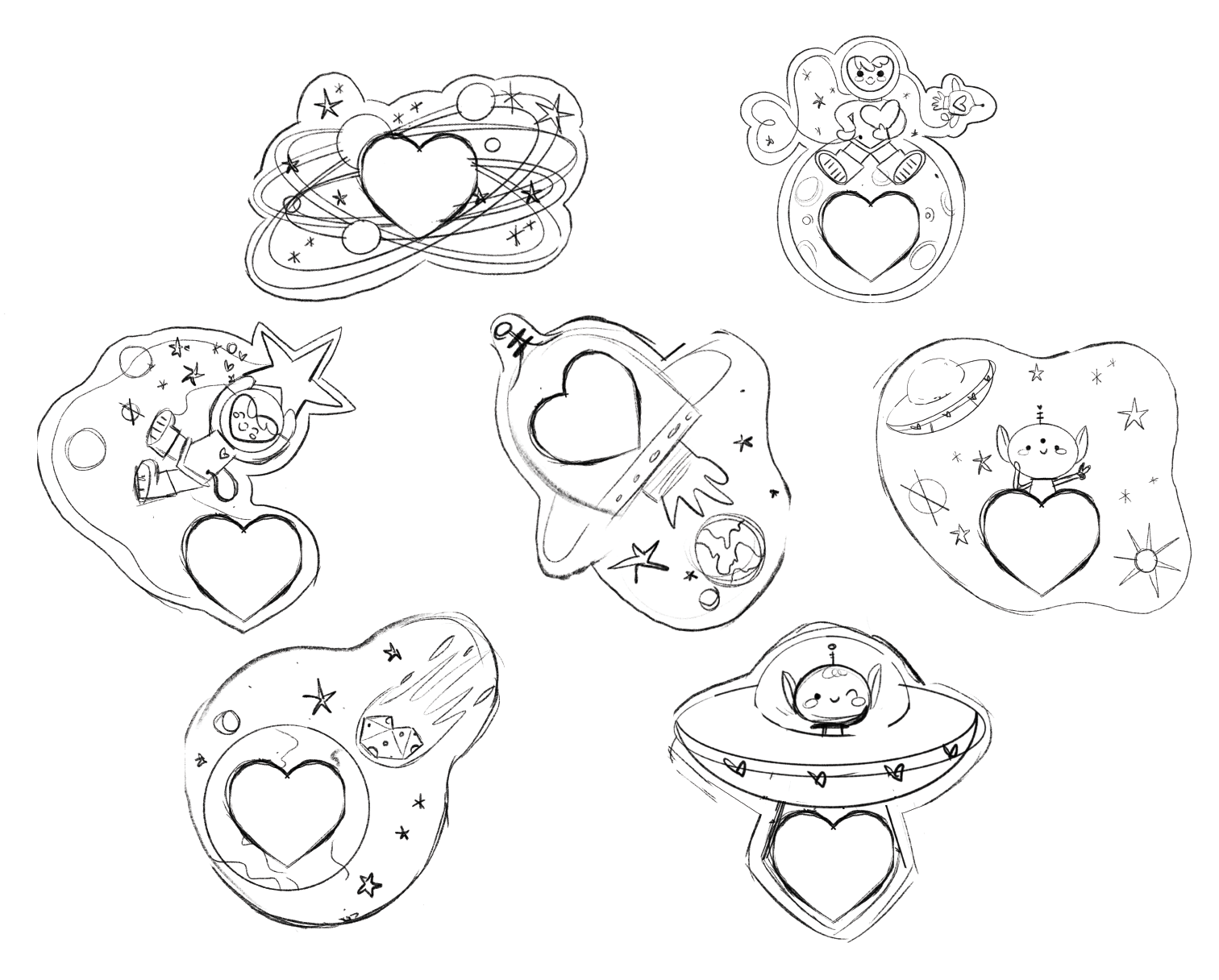 Created seven vibrant galaxy-themed Valentine cards featuring playful space illustrations and cosmic pun-based messages for a slime gift set.