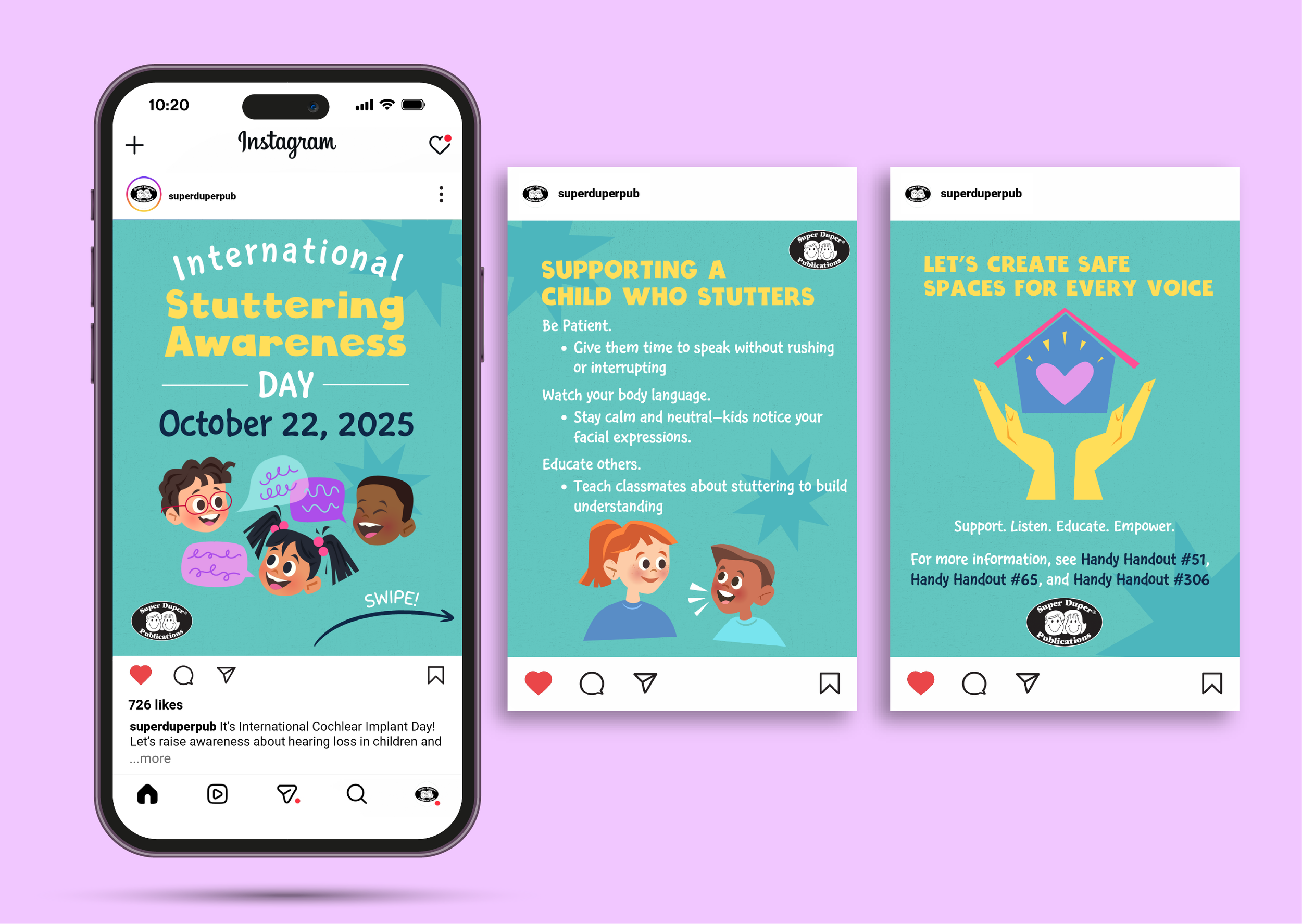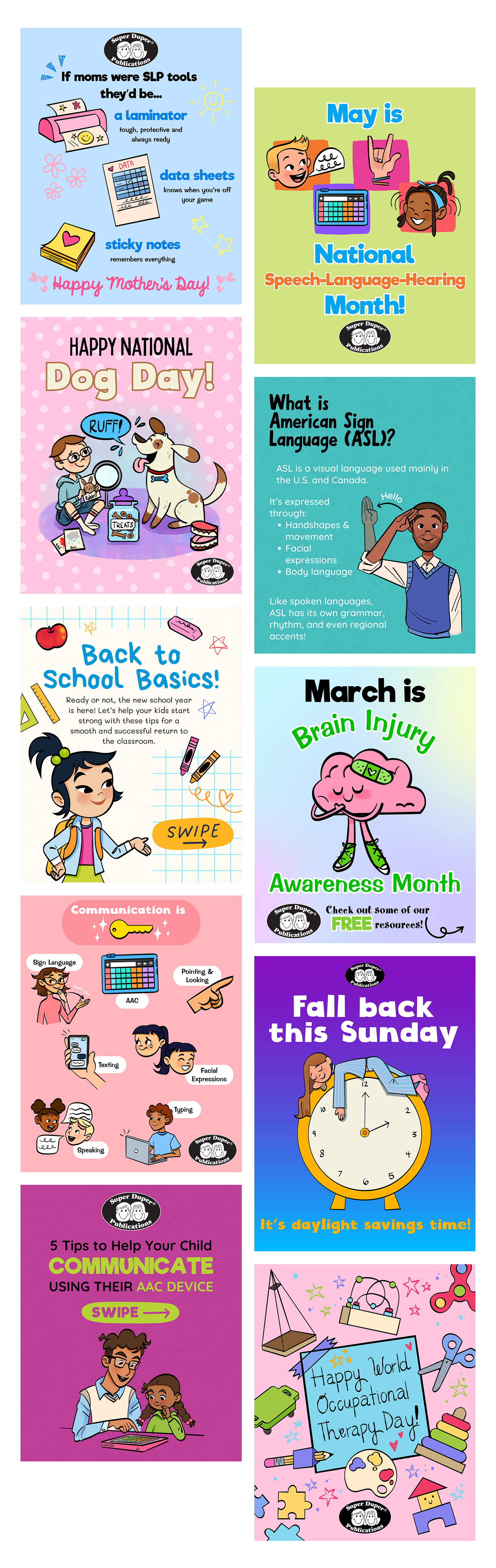 Illustrated and designed a range of social media graphics for Super Duper Publications, maintaining the brand’s bright, playful, and educational style. Created engaging posts that provide helpful information and resources for SLPs.